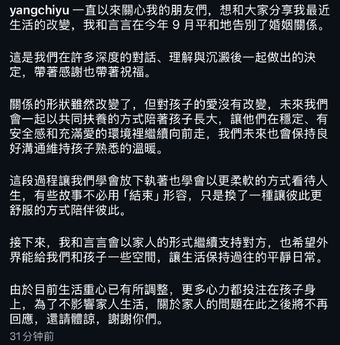 12月8日,棒棒堂成员小煜发长文宣布离婚。他表示,关系的形状虽然改变了,但对孩子的爱没有改变,未来会共同抚养孩子。杨奇煜... 12月8日,棒棒堂成员小煜发长文宣布离婚。他表示,关系的形状虽然改变了,但对孩子的爱没有改变,未来会共同抚养孩子。