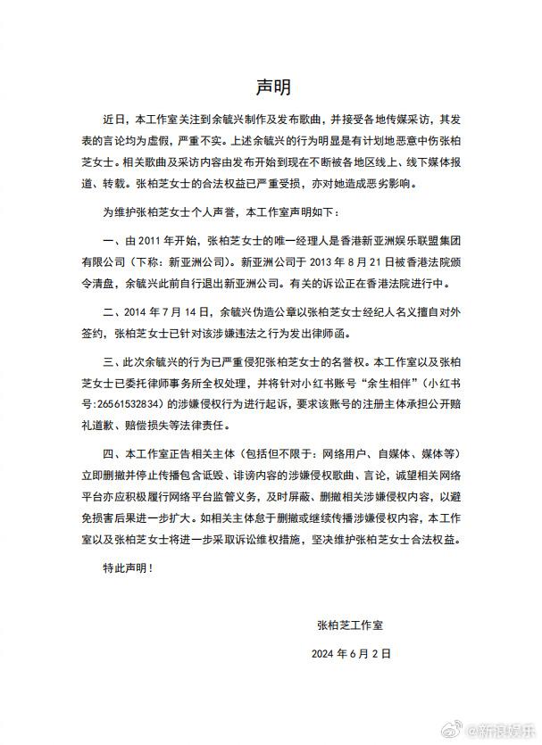 对此张柏芝工作室发布声明回应,称余毓兴歌曲及相关言论均为虚假,严重不实,张柏芝已委托律师对侵权行为进行起诉。此外,余毓兴还曾在2014年伪造公章以张柏芝经纪人名义擅自对外签约,张柏芝已就该行为发出律师函。