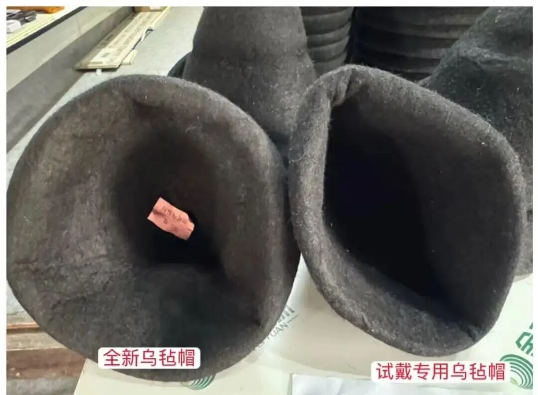 据了解,传统乌毡帽以优质羊毛经过72道工序制作而成,纤维紧密,具有独特的保暖性与挺括感。但也正因这种材质特性,它极易吸附头油、皮屑与气味,且难以彻底清洁。多次试戴不仅会导致卫生问题,更会使帽围逐渐松弛、失去原有版型,严重影响二次销售。