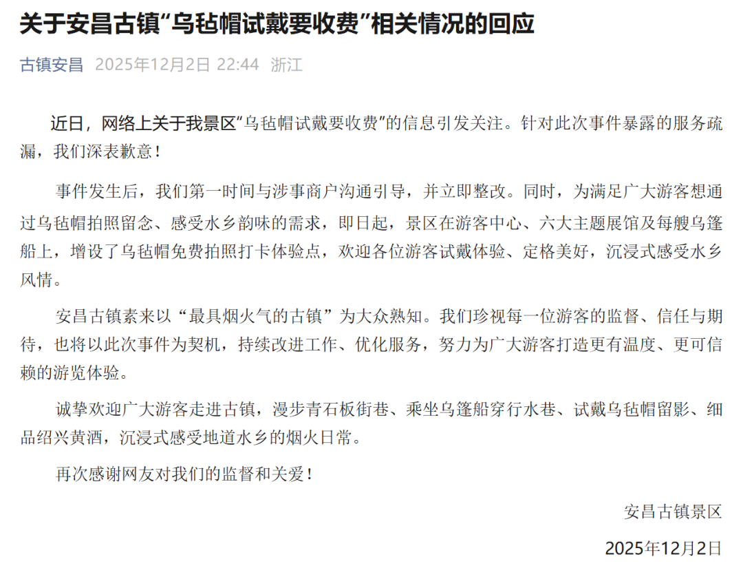 12月2日,安昌古镇景区发布相关情况回应,并在景区多处增设了多个免费试戴点。
