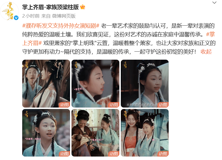 12月9日,剧方发文回应:“老一辈艺术家的鼓励与认可,是新一辈对表演的纯粹热爱的温暖土壤。我们欣喜见证,这份对艺术的赤诚在家庭中温馨传承。戏里萧家的‘掌上明珠’云萱,温暖着整个萧家,也让大家对家族和正义的守护更加有动力~隔代的支持,是温暖的传承,一起守护这份初绽的美好!”
