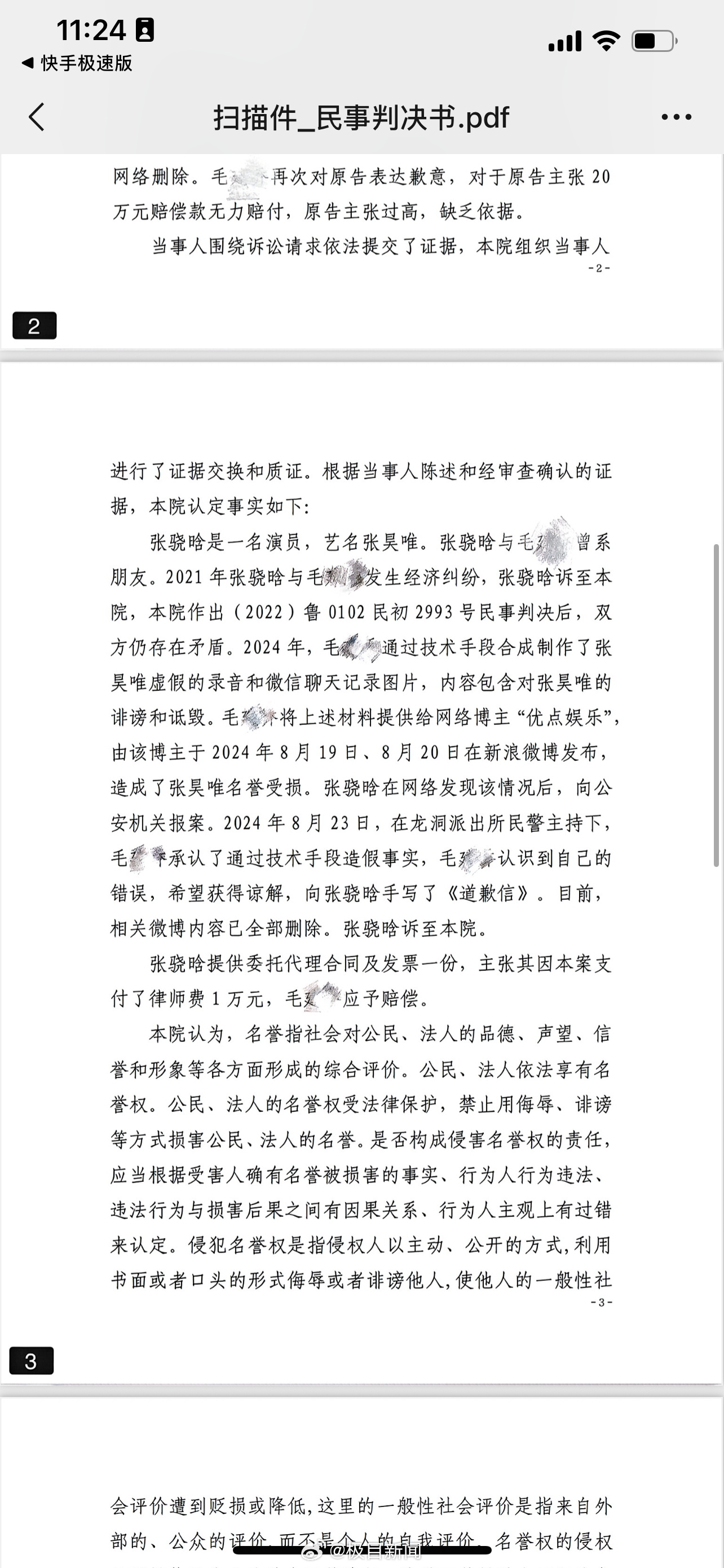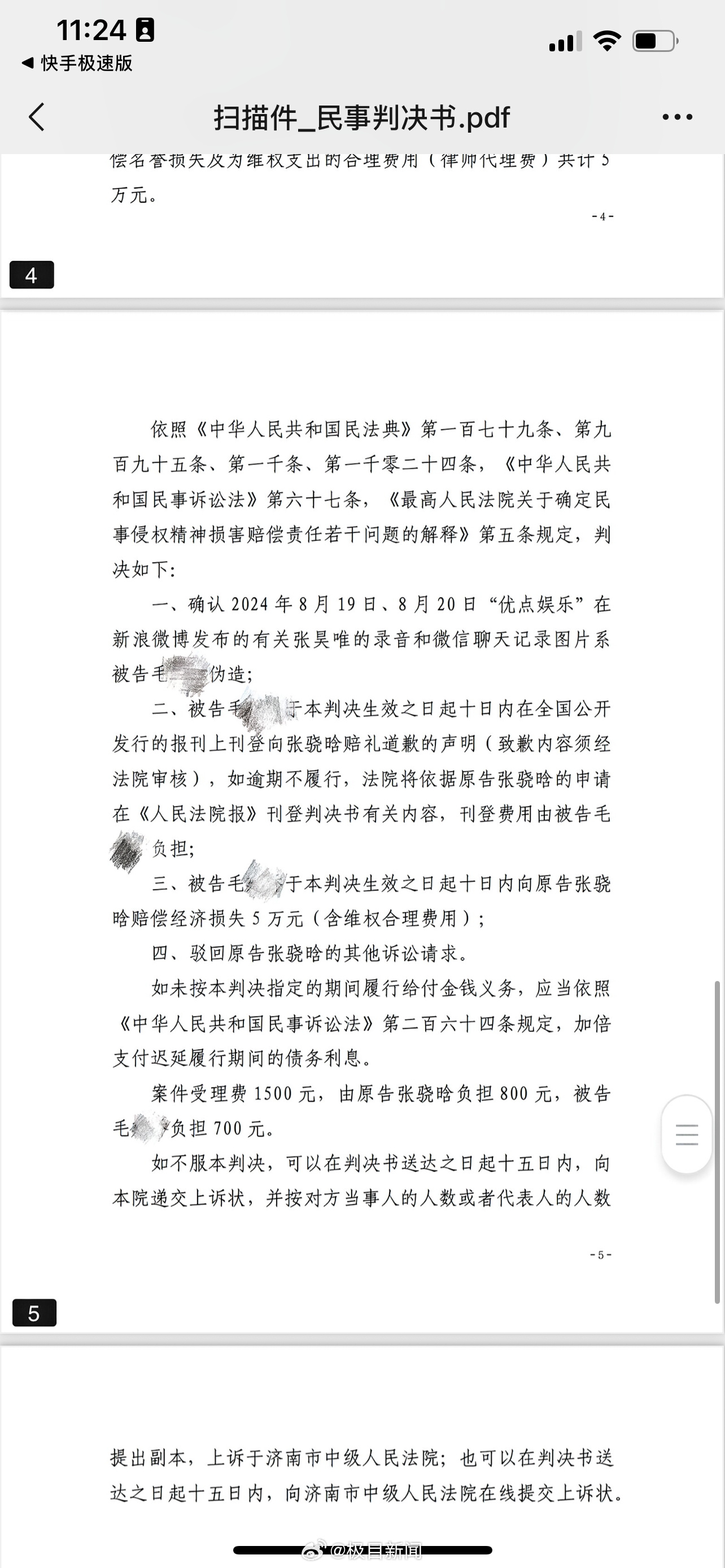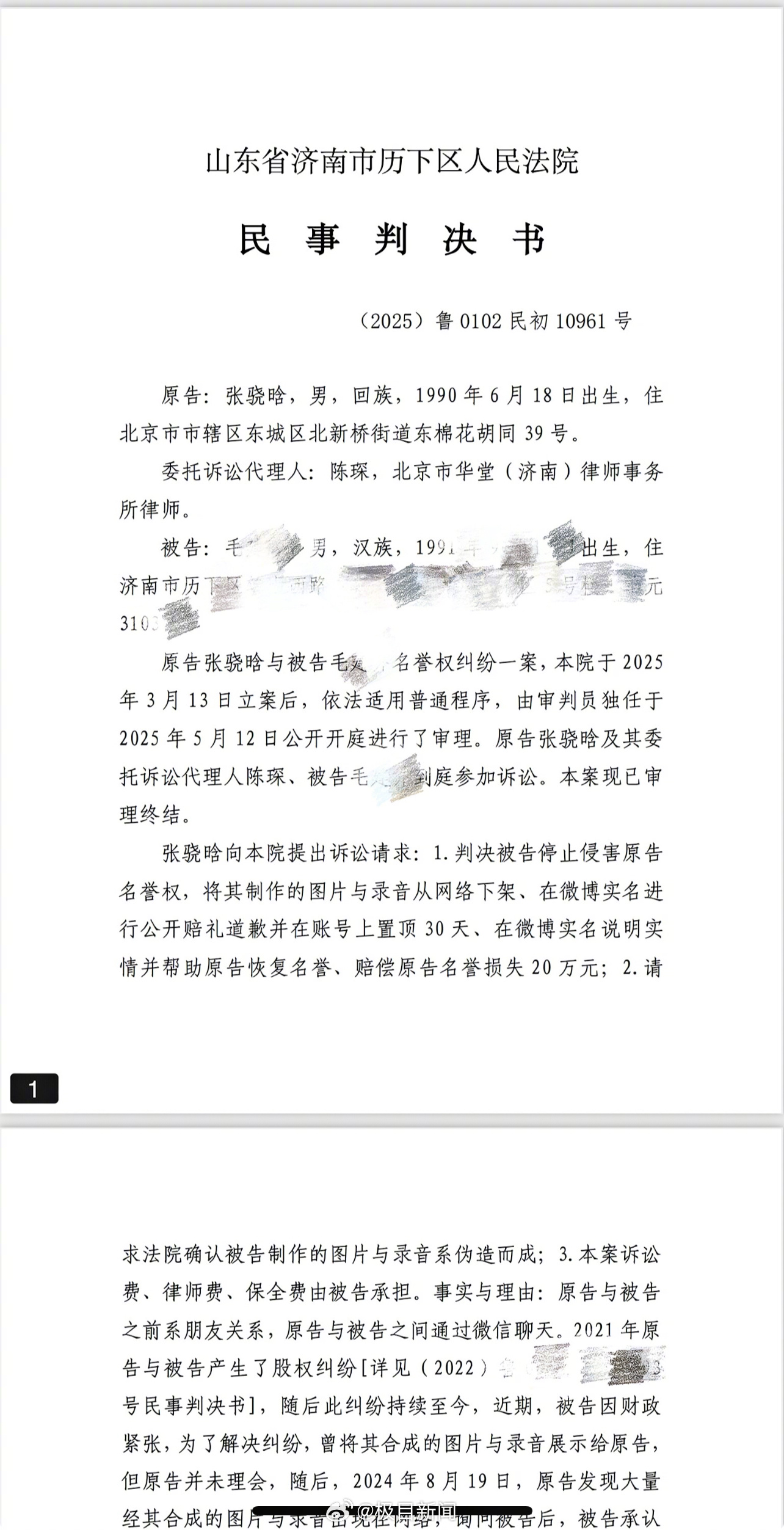 近日,山东省济南市历下区人民法院就演员张昊唯(原名张骁晗)名誉权纠纷案作出一审判决。法院认定被告毛某某通过合成虚假录音、... 近日,山东省济南市历下区人民法院就演员张昊唯(原名张骁晗)名誉权纠纷案作出一审判决。法院认定被告毛某某通过合成虚假录音、聊天记录等方式散布不实信息,构成对张昊唯名誉权的侵害,判决其在全国公开发行的报刊上刊登赔礼道歉声明,并赔偿经济损失五万元。