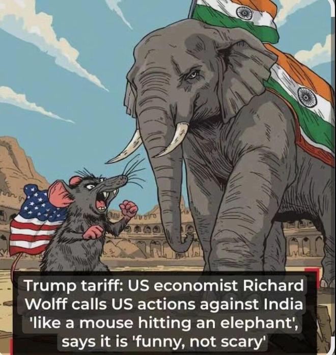 哦,我看到,有人还专门画了一张漫画,引述美国经济学家的说法,美国对印度的关税,就像 " 老鼠打大象 "," 很有趣,但不吓人 "。