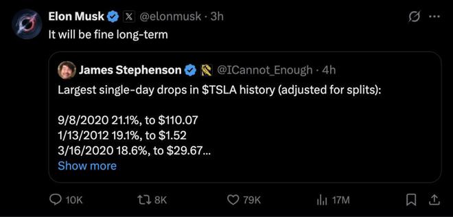 对此,马斯克在社交媒体上回应称“从长期来看,一切都会好起来。”