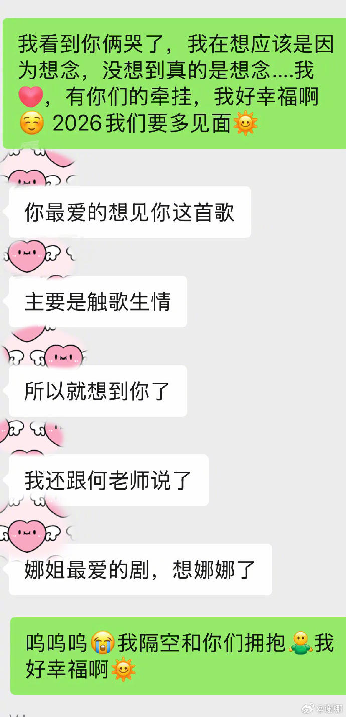 谢娜分享的照片中,可以看到他们之间的对话。谢娜说:“我看到你俩哭了,我在想应该是因为想念,没想到真的是想念……有你们的牵挂,我好幸福啊。2026我们要多见面。”李维嘉回应:“你最爱的《想见你》这首歌,主要是触歌生情,所以就想到你了……”