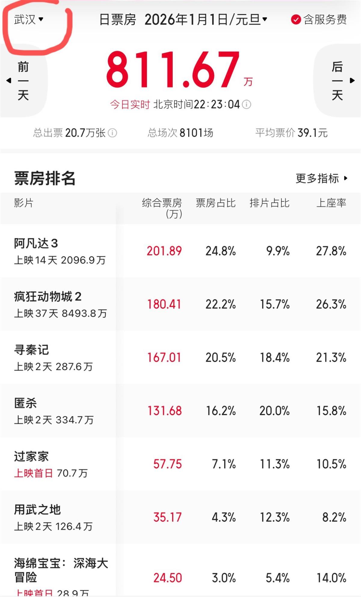 观影数据显示,1月1日当天,武汉观众贡献票房最多的电影是《阿凡达3》,其次是《疯狂动物城2》,而暂居当日票房亚军的是古天乐主演的《寻秦记》。关键时刻,武汉地区的“项少龙”粉丝们发力了。