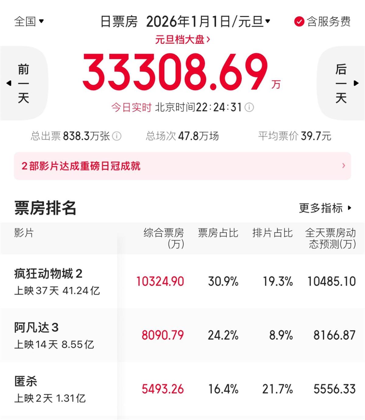 截至1月1日22时,今年元旦档(1月1日-1月3日)总票房已接近3.8亿(含预售)。从全国影院的排片趋势来看,如无意外,《疯狂动物城2》和《阿凡达3》将持续领跑元旦档。