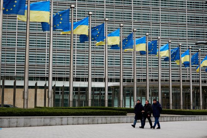 2025年2月24日,在比利时布鲁塞尔,人们走过欧盟总部 新华社记者孟鼎博摄