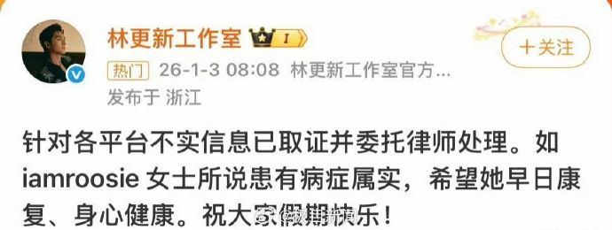 对此,林更新工作室发布消息,针对各平台不实信息已取证并委托律师处理。如 iamroosie 女士所说患有病症属实,希望她早日康复、身心健康。祝大家假期快乐!