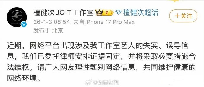 檀健次工作室发布消息,近期,网络平台出现涉及我工作室艺人的失实、误导信息,我们已委托律师安排证据固定,并将采取必要措施合法维权。请广大网友理性甄别网络信息,共同维护健康的网络环境。