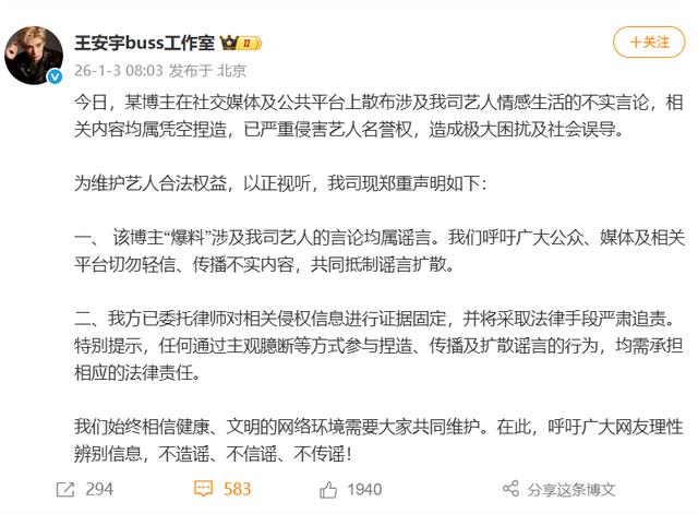 1月3日,王安宇工作室发布声明,全文如下,