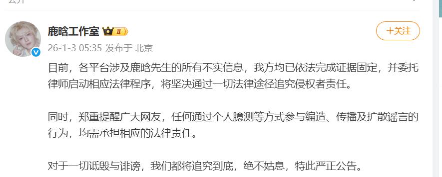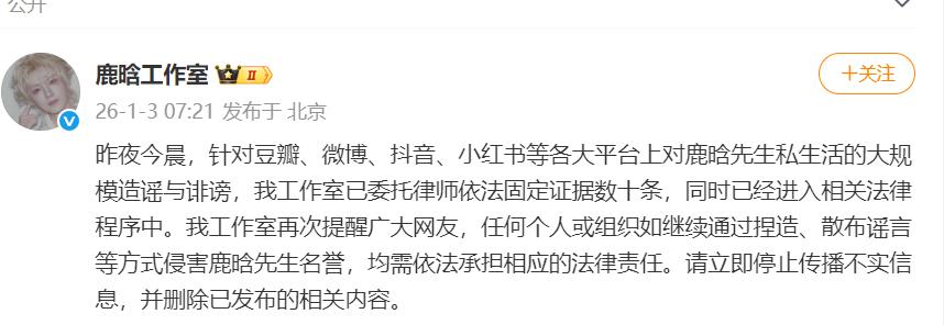 1月3日早晨,男星鹿晗工作室发文:昨夜今晨,针对豆瓣、微博、抖音、小红书等各大平台上对鹿晗先生私生活的大规模造谣与诽谤,我工作室已委托律师依法固定证据数十条,同时已经进入相关法律程序中。我工作室再次提醒广大网友,任何个人或组织如继续通过捏造、散布谣言等方式侵害鹿晗先生名誉,均需依法承担相应的法律责任。请立即停止传播不实信息,并删除已发布的相关内容。