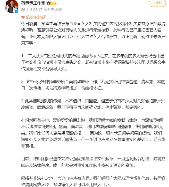 3日凌晨,范丞丞工作室发文称:某博主再次发布与我司艺人相关的偷拍内容及将不相关素材添油加醋混淆视听,蓄意引导公众对其私人关系进行无端揣测,此种行为已严重损害艺人名誉。工作室对此发出严肃声明,并表示,律师团队已连夜完成证据固定与法律文件起草,一旦达到起诉标准,必将立即启动法律程序。