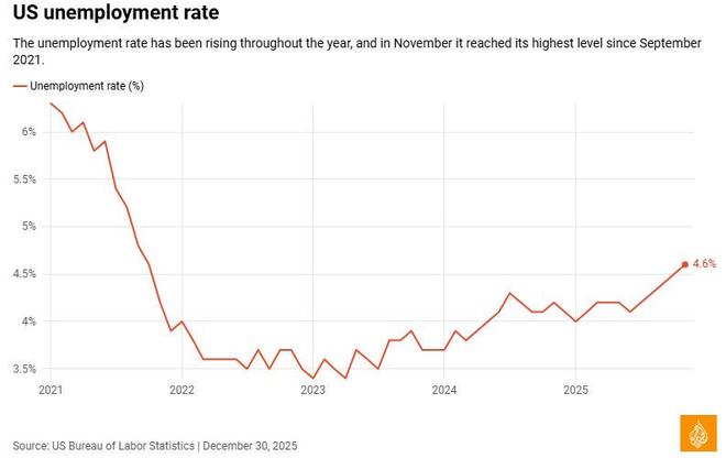 特朗普1月份上台以来,美国失业率一直在稳步上升 半岛电视台制图