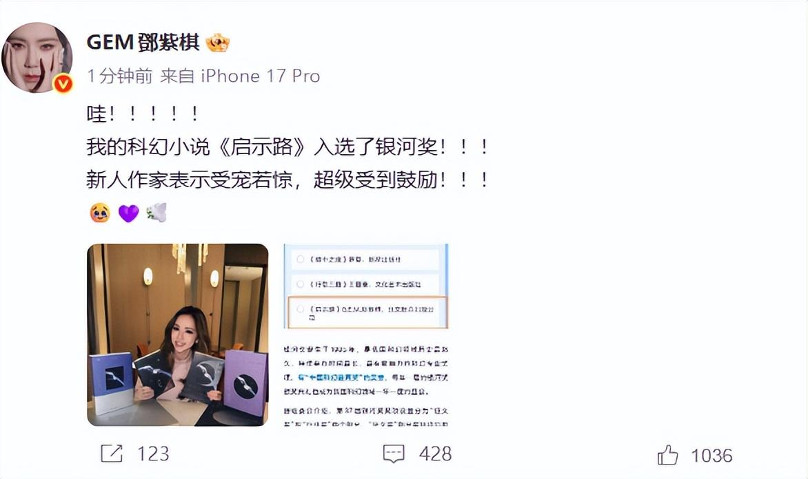 1月4日,邓紫棋发文回应所著小说《启示路》入选银河文学奖:新人作家表示受宠若惊,超级受到鼓励!!!