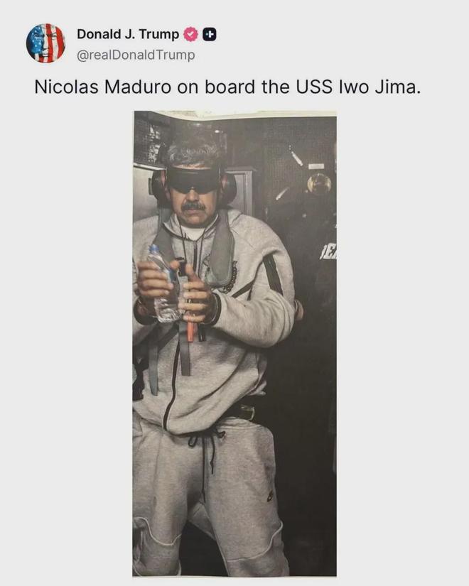 特朗普还发布了照片,可怜的马杜罗,前一天还是总统,后一天被戴着手铐、蒙上眼睛,应该在押往美国的途中。