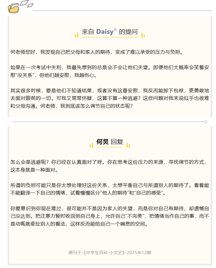 据悉,《中学生百科》杂志的“快乐如何”栏目是何炅专栏,何炅每周会精选一个中学生提问亲自回复,内容涵盖青春期困惑、家庭关系、学业压力等方向。他的回复以细腻温暖著称,被读者称为"迷茫时的温柔铠甲"。