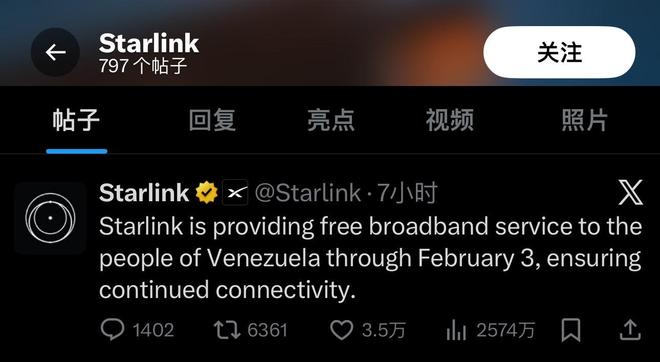 “星链”通过社交媒体发文称:“将为委内瑞拉民众提供免费宽带服务至2月3日,确保网络连接不中断。”