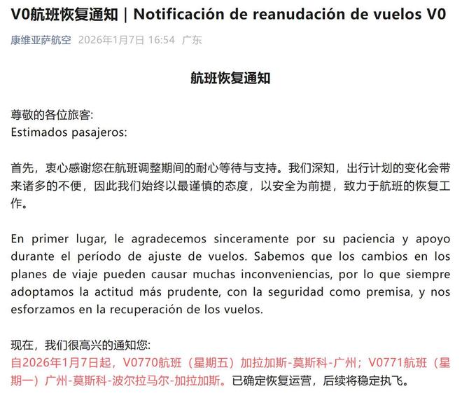 1月7日下午,委内瑞拉康维亚萨航空公司发布航班恢复通知:自2026年1月7日起,V0770航班(星期五)加拉加斯-莫斯科-广州;V0771航班(星期一)广州-莫斯科-波尔拉马尔-加拉加斯,已确定恢复运营,后续将稳定执飞。