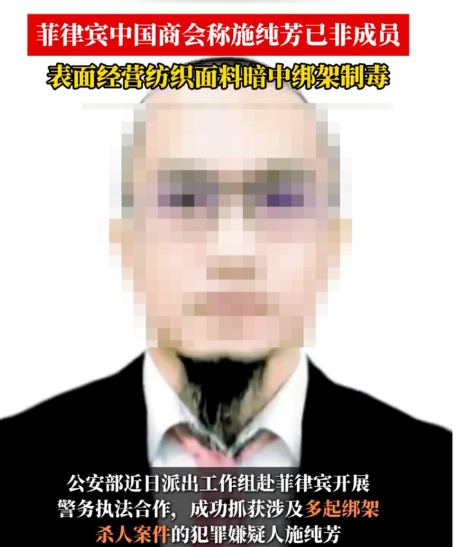 披着生意外衣的施纯芳,实际在菲律宾干着涉嫌绑架、杀害中国人的勾当。据中国驻菲律宾大使馆2025年12月22日披露,“施纯芳涉嫌多起针对中国公民的绑架、杀人等严重刑事案件。中菲两国执法部门经过2年多艰苦调查和追捕,近期发现其在菲藏匿地点,经过周密布控,最终一举将其抓获。”