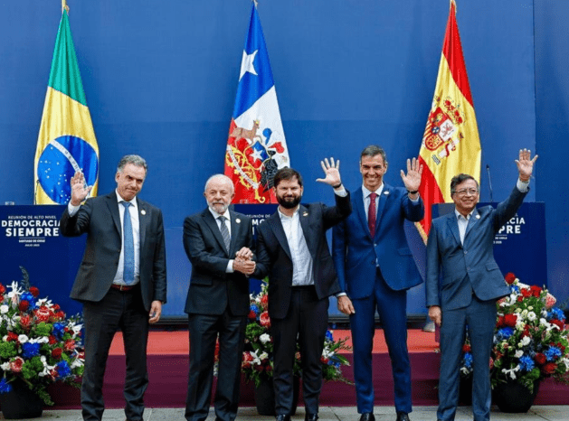 巴西总统卢拉、西班牙首相佩德罗、哥伦比亚总统古斯塔沃、乌拉圭总统亚曼杜与智利总统博里奇在圣地亚哥举行会晤