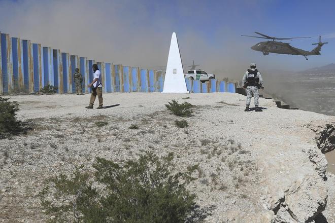 ▲当地时间2025年11月7日,墨西哥华雷斯城,墨西哥军队士兵观察美军直升机飞过 图据视觉中国