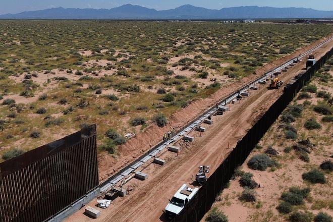 ▲当地时间2025年9月6日,墨西哥奇瓦瓦州华雷斯城,美国工人在边境安装金属围栏 图据视觉中国