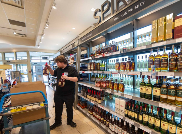 3月4日,在加拿大安大略省的奥克维尔,一家LCBO门店的店员从货架上撤下美国品牌酒产品(图/新华社发 邹峥摄)