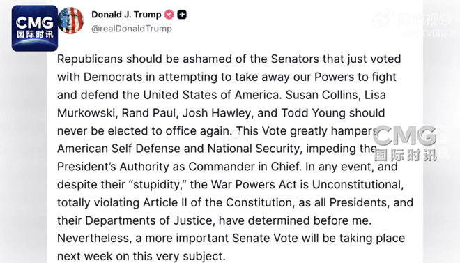 阿克西奥斯新闻网提到,白宫方面表示,即使未来该决议在国会获得通过,特朗普也将予以否决。而8日晚些时候,特朗普猛烈抨击了帮助民主党通过该法案的5名共和党参议员。《华尔街日报》称,他在“真实社交”上发帖称,“共和党人应该为刚刚与民主党人一起投票的参议员感到羞耻”。他提到,这些议员“永远不应该再当选公职”,这次投票“极大地妨碍了”美国的自卫能力,且该投票所援引的法律本身并不合宪。