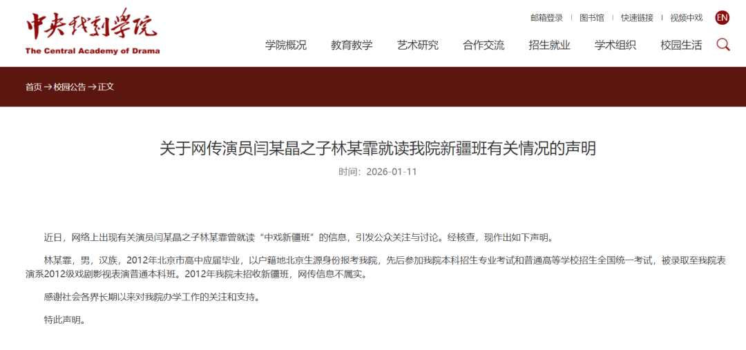 中央戏剧学院否认演员闫某晶之子就读“中戏新疆班”:网传信息不属实