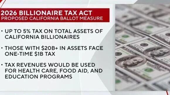 作为背景,当地的工会正在推动一项公投,对所有净资产超过10亿美元的加州居民一次性征收总资产5%的税款。该“巨富税”适用于截至今年1月1日居住在加州的任何人,可以从2027年起在5年内分期缴纳。