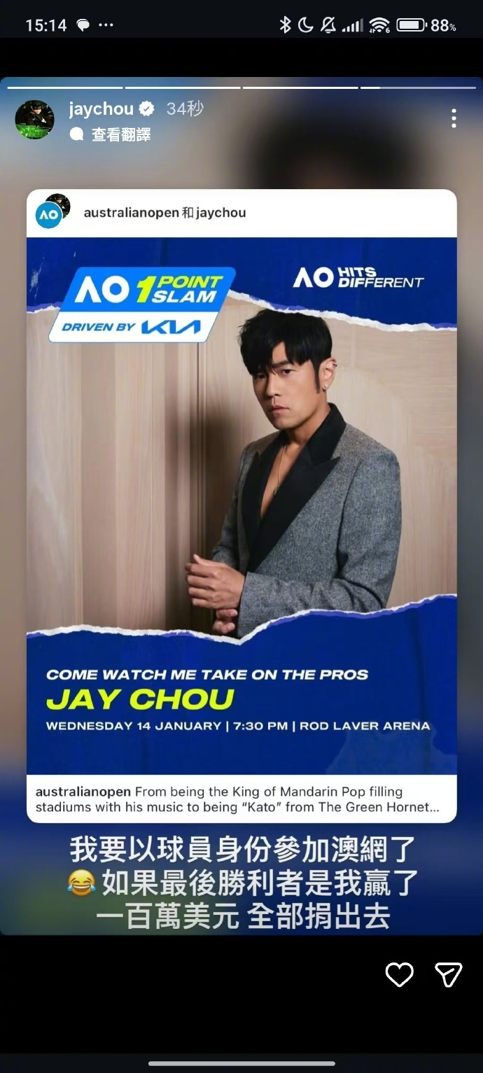 周杰伦要打澳网了!“如果我赢了,100万美元全部捐出去”