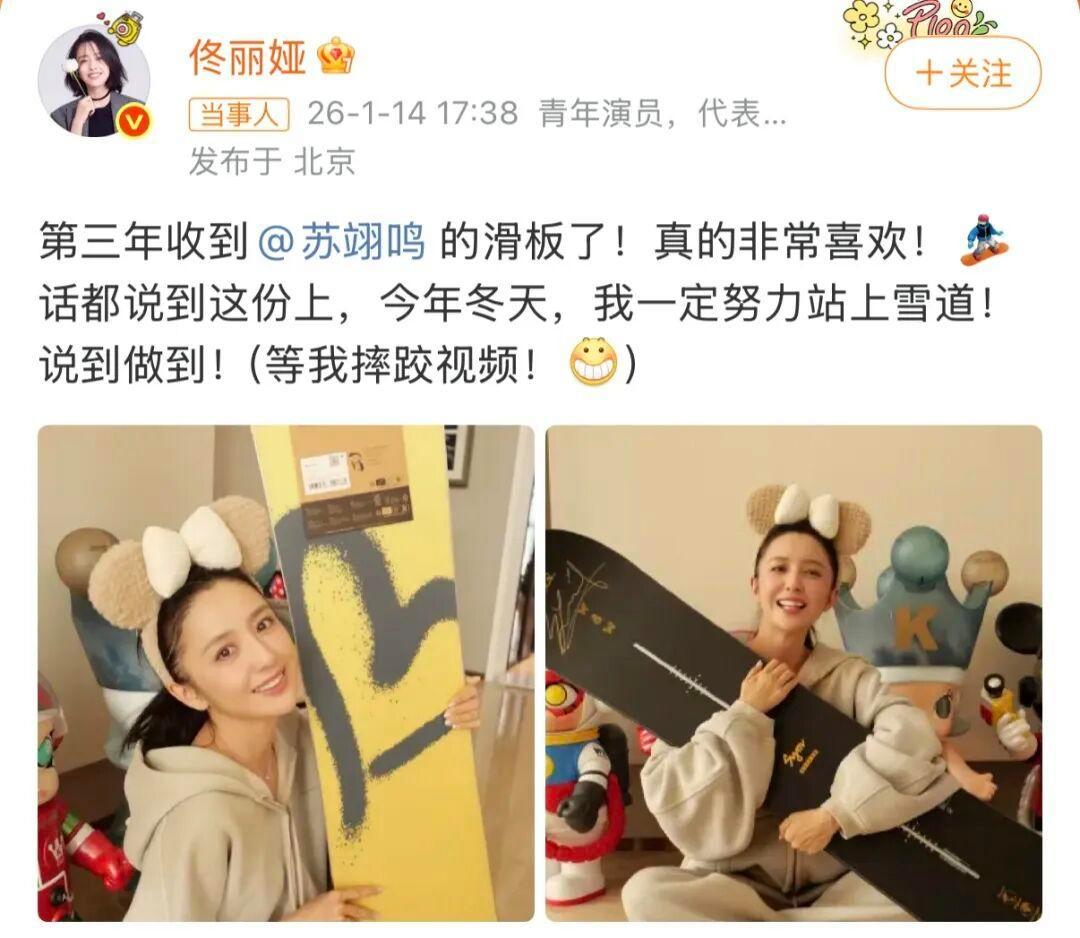 昨晚,女演员佟丽娅在个人社交平台发文并晒图:第三年收到苏翊鸣的滑板了!真的非常喜欢!话都说到这份上,今年冬天,我一定努力站上雪道!说到做到!(等我摔跤视频)