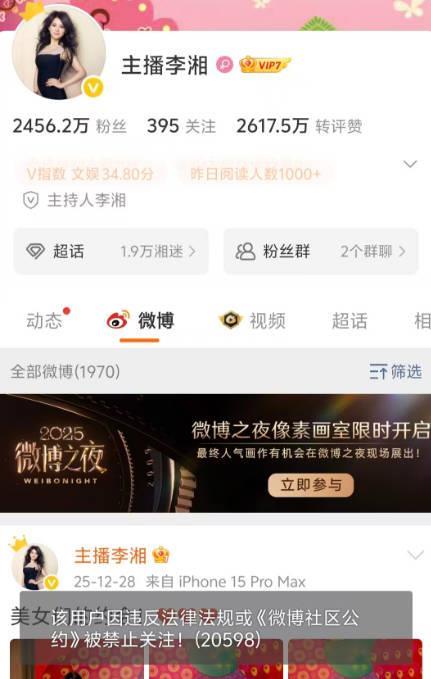 李湘多平台账号被禁止关注,“因违反法律法规或《微博社区公约》被禁止关注”