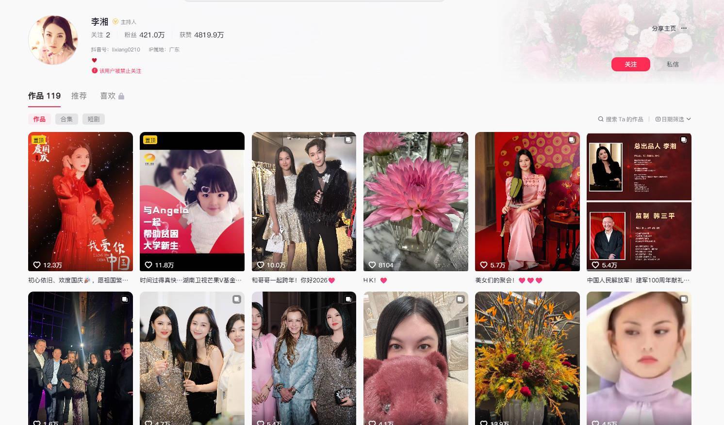 极目新闻记者 丁伟 刘琴1月16日,极目新闻记者注意到,前湖南卫视主持人李湘的抖音、小红书和微博的账号被禁止关注。网络截... 极目新闻记者 丁伟 刘琴