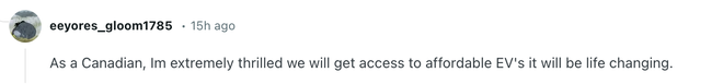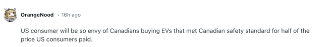 有自称是加拿大人的网友表示不仅不后悔,还很“激动”:“作为一名加拿大人,我为我们将能买到能负担得起的电动汽车而非常激动,这将改变我们的生活。”↓