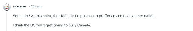 有网友直言美国会“后悔试图霸凌加拿大”