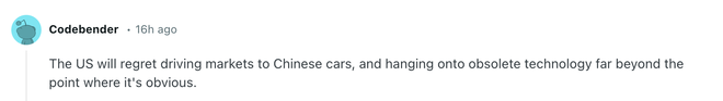 有网友称该“后悔”的应该是美国:“美国将会后悔把市场推向中国,并死守着显而易见早已过时的技术不放。”↓