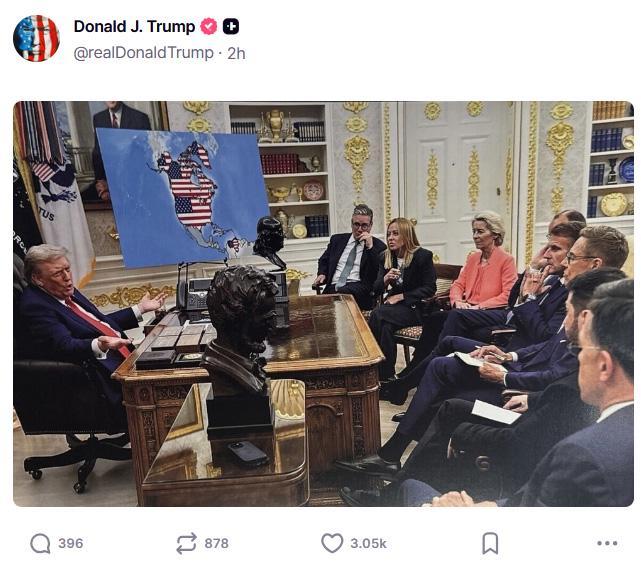 其中一张图片拍摄于去年8月,记录了当时欧洲领导人在白宫与特朗普会面的场景。但原图背景中展示乌克兰冲突前线态势的地图,被替换成了美国国旗覆盖美国本土、加拿大、格陵兰岛和委内瑞拉的美洲地图。