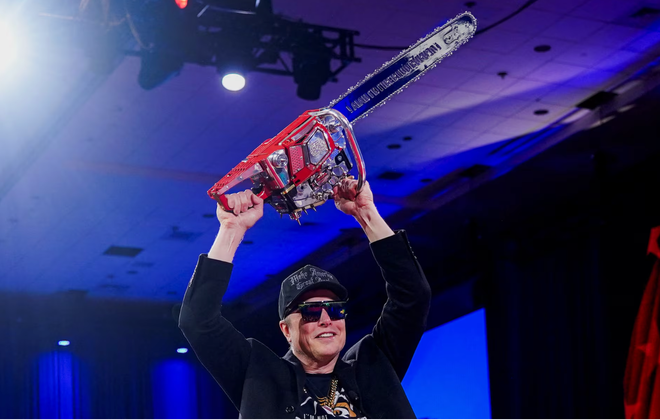 当地时间2月20日,马斯克高举米莱送给他的电锯 图自外媒