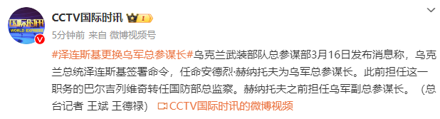 来源:CCTV国际时讯微博乌克兰武装部队总参谋部3月16日发布消息称,乌克兰总统泽连斯基签署命令,任命安德烈·赫纳托夫... 来源:CCTV国际时讯微博