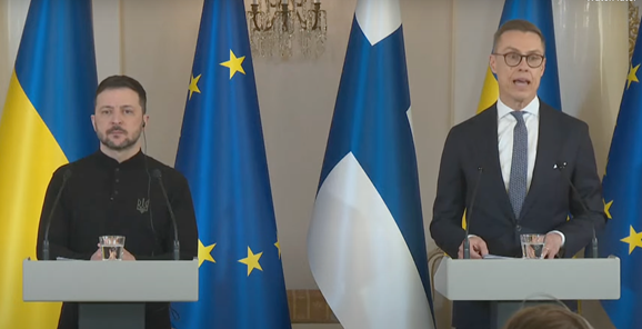 3月19日,泽连斯基(左)与芬兰总统斯图布在赫尔辛基举行新闻发布会 图源:英媒