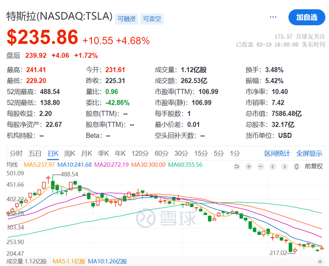 特朗普胜选一度显著提振了特斯拉股价,特斯拉从去年11月初开始曾一路大涨,并创下了488.54美元/股的历史最高股价。然而,特斯拉今年以来股价累计下跌了超过41%,截至美东时间周三收盘,其股价为235.86美元/股,较去年12月创下的历史峰值腰斩。