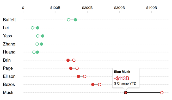 马斯克财富净值也随之缩水1130亿美元 图片来源:彭博亿万富翁指数