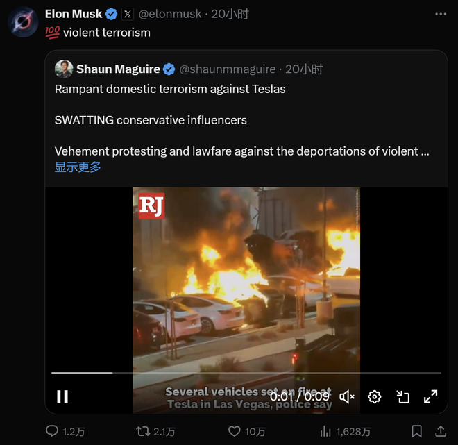 同日,马斯克在社交平台上连发多帖,指责针对特斯拉的一系列行为是“暴力恐怖主义”行径。“如此程度的暴力行为简直丧心病狂,而且大错特错。”马斯克写道,“特斯拉仅仅是制造电动汽车,根本没有做过任何该遭受这些恶意攻击的事情。”