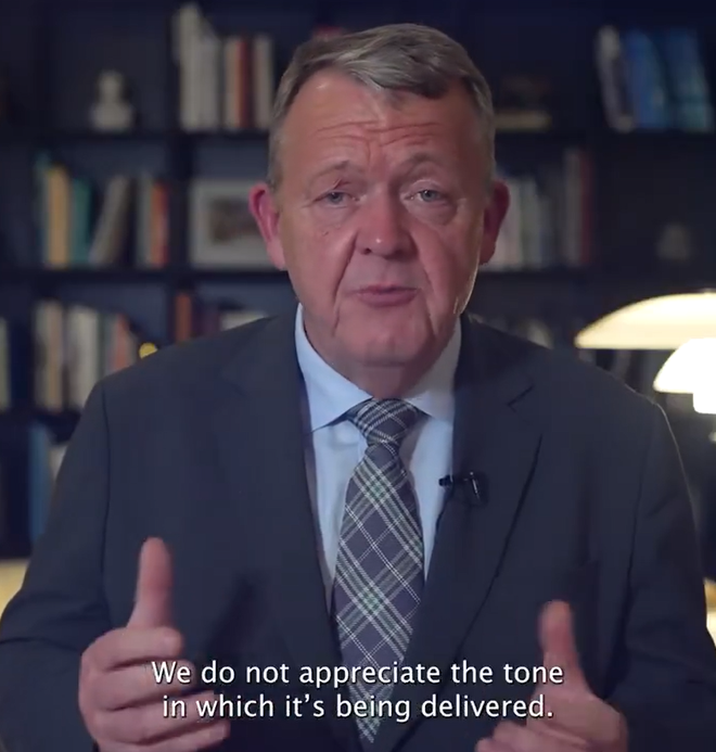 “我有话要对我们的美国朋友和其他所有正在收听的人说。这些天人们议论纷纷。有很多指控,很多指控。当然,我们愿意接受批评。”拉斯穆森在视频开头称,“但请让我完全坦白地说:我们不喜欢这种说话的语气。”