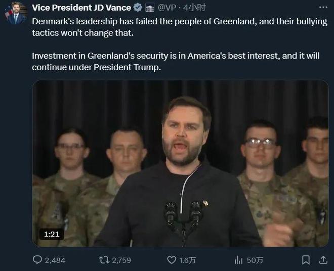 万斯在讲话中批评丹麦,还强扯中俄 推文截图