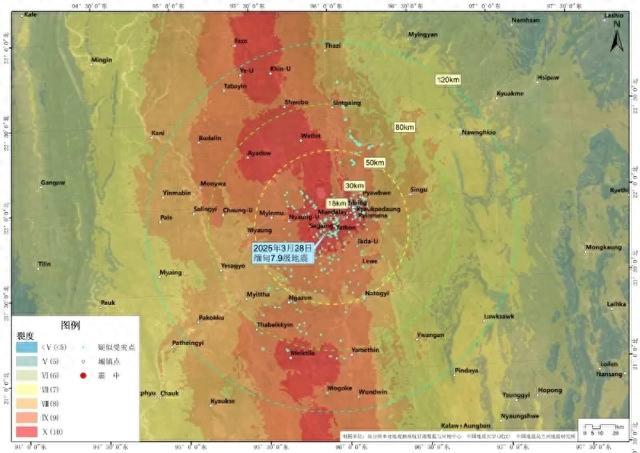 震中120公里范围疑似受灾点位分布图。图源中国高分观测公众号