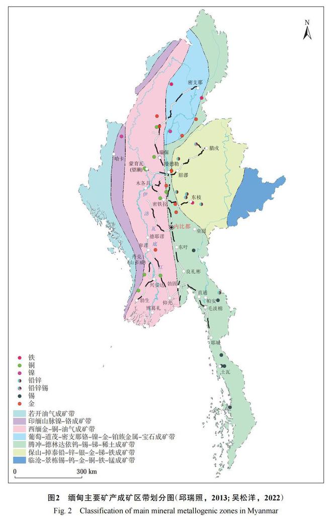 若开油气成矿带、印缅山脉镍–铬成矿带、西缅金–铜–油气成矿带、葡萄–道茂–密支那铬–镍–金–铂族金属–宝石成矿带以及腾冲–德林达依钨–锡–锑–稀土成矿带等。
