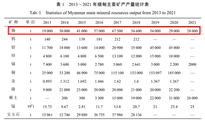 缅甸主要矿产产量统计表 图片来源:《缅甸地质矿产特征与矿业投资环境分析》